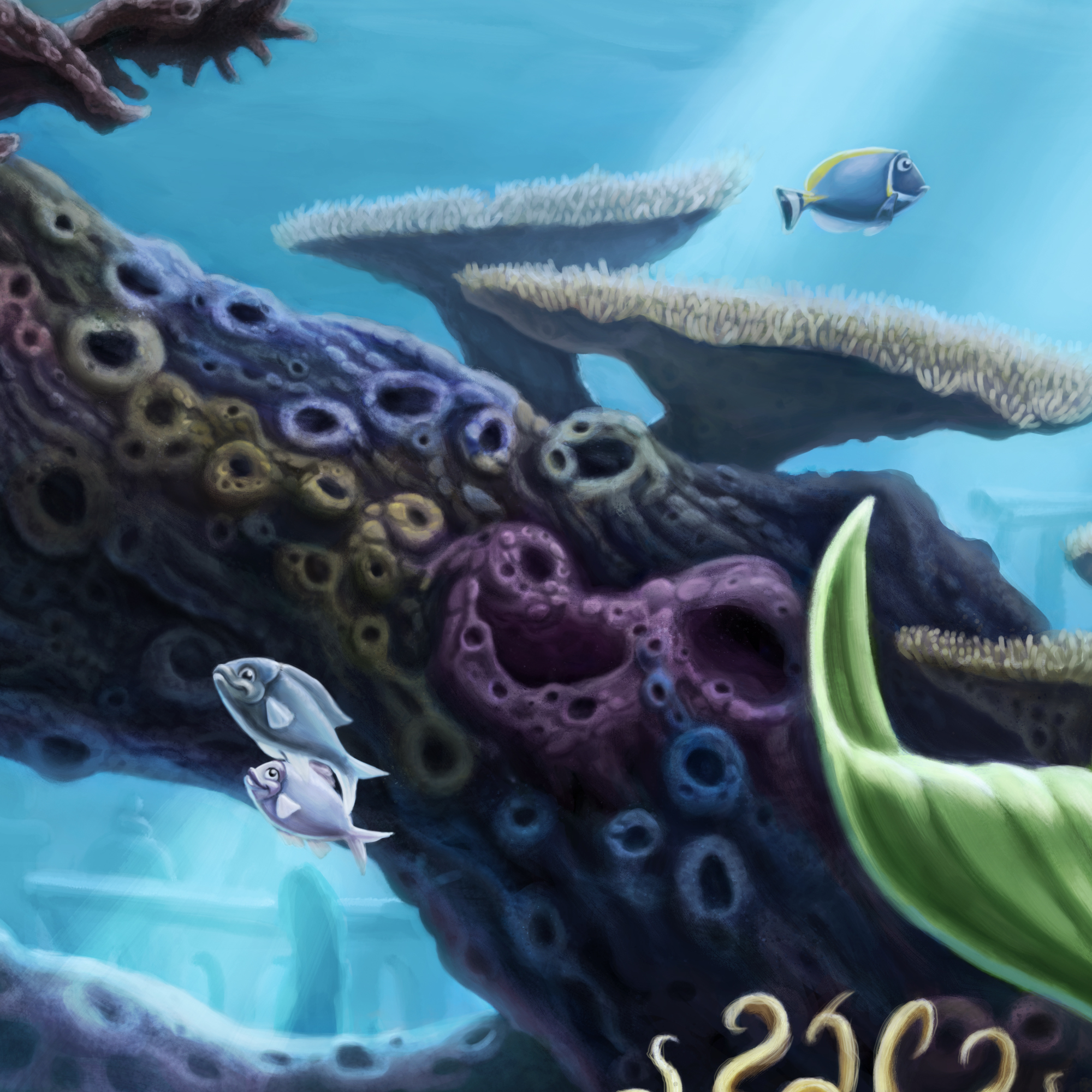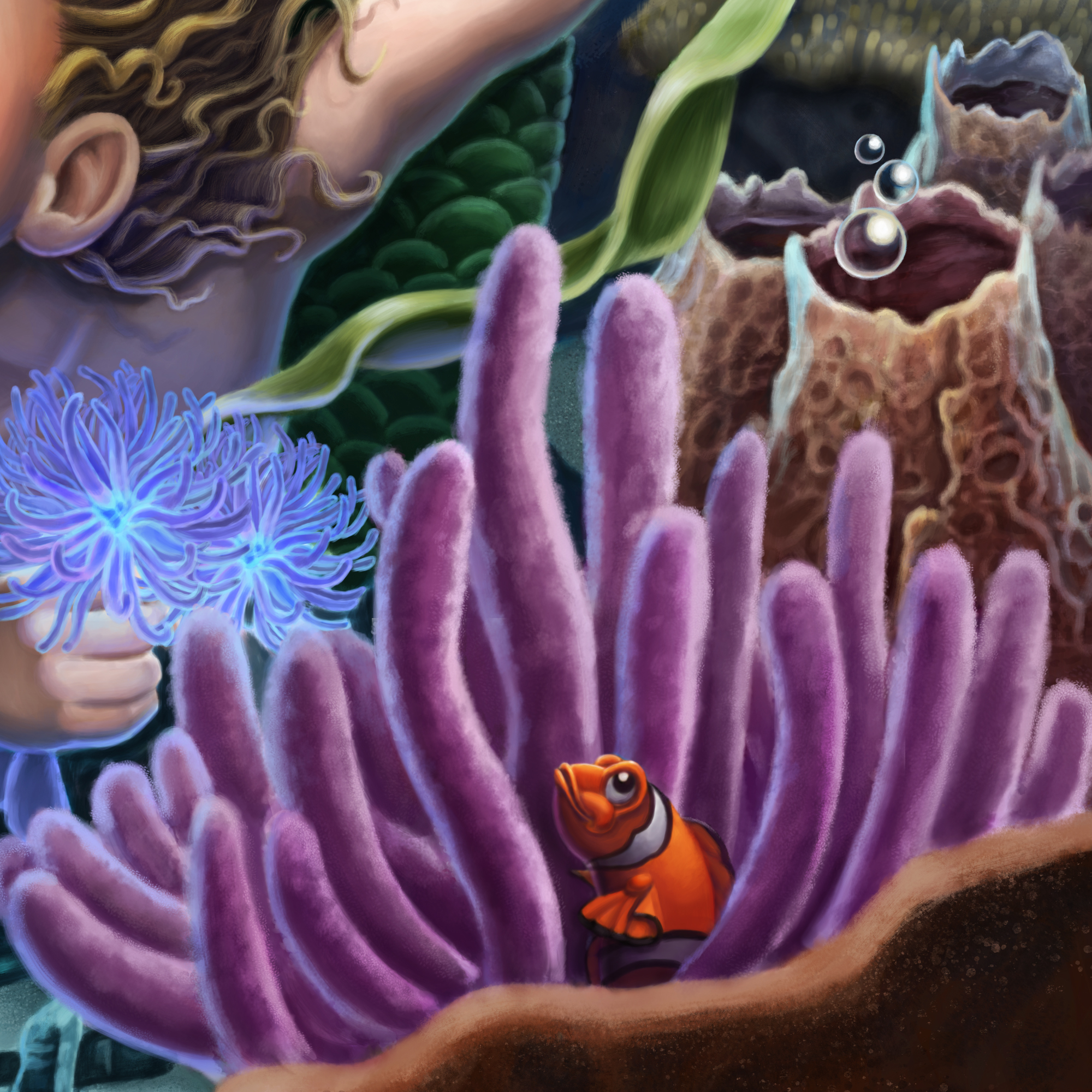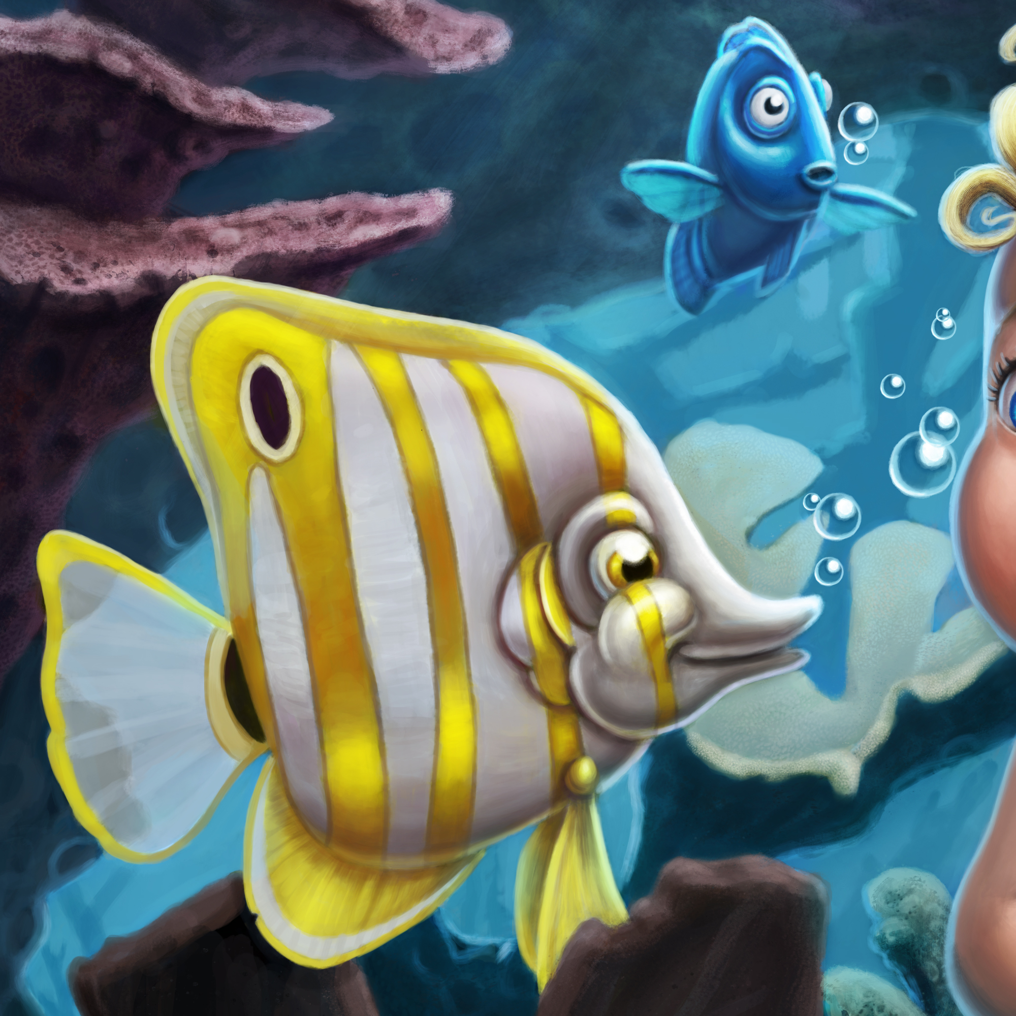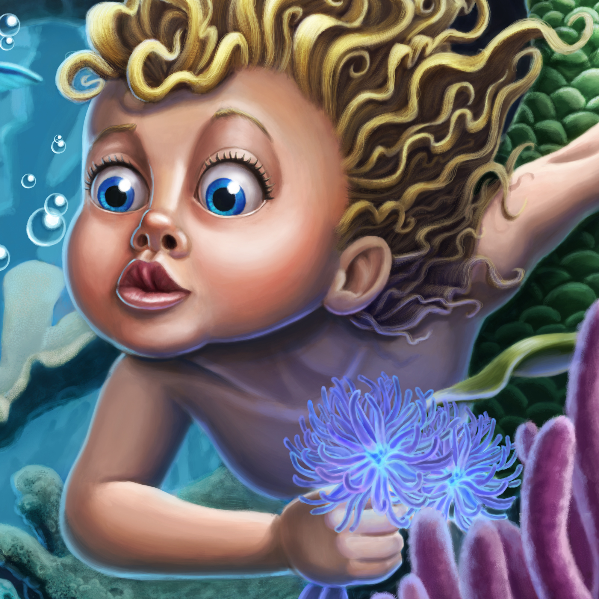 I was comissioned to create this enchanting illustration of a baby mermaid as a special gift for a newborn niece and her family. Their request was for an illustration that would captivate her young imagination and be a an artwork she would chrish for years to come. The concept was to depict the little mermaid Coral, playing with her fish friends in a beautiful coral garden. This art work was created as a digital painting, which was printed on canvas, and then refined with delicate oil paint touches.