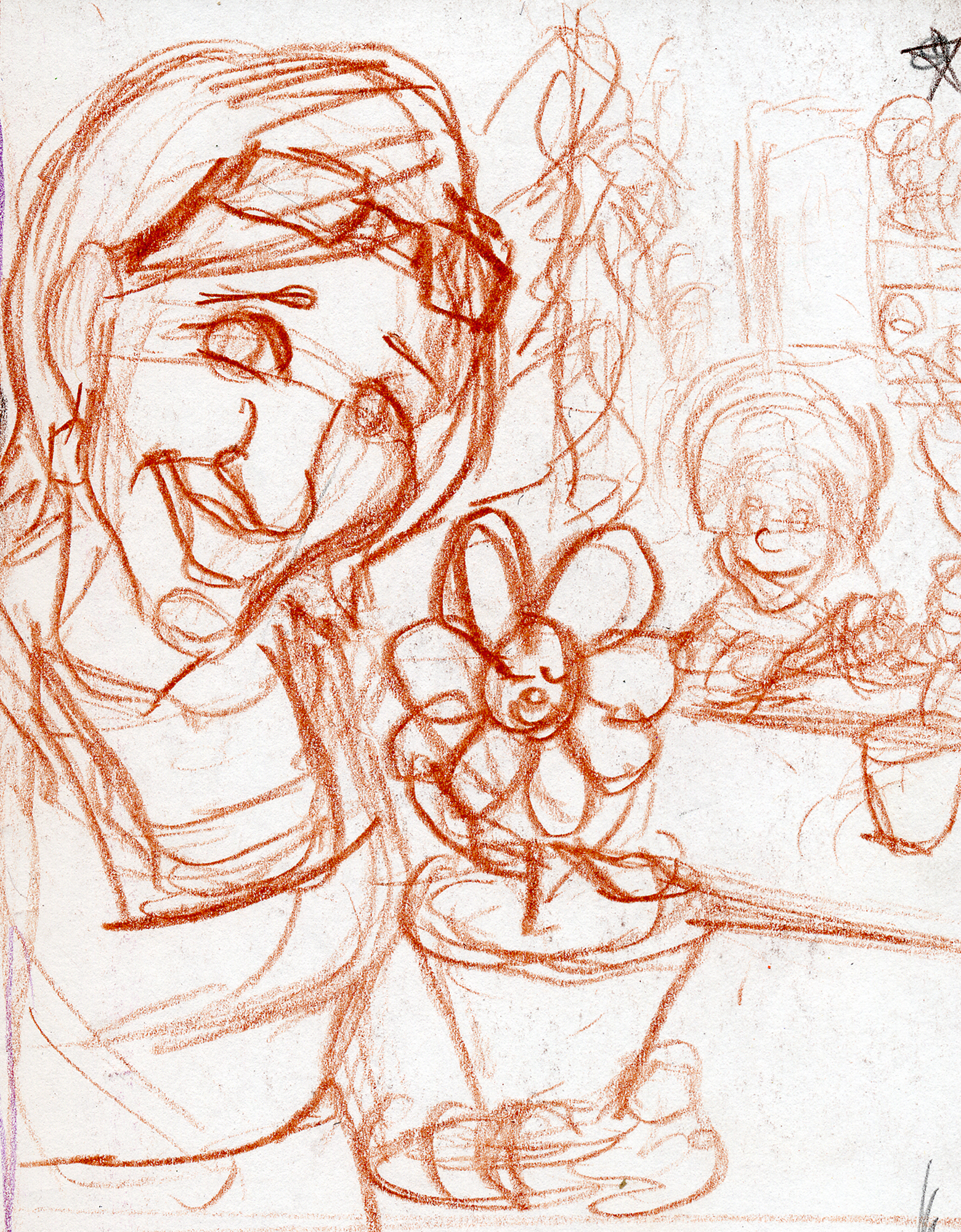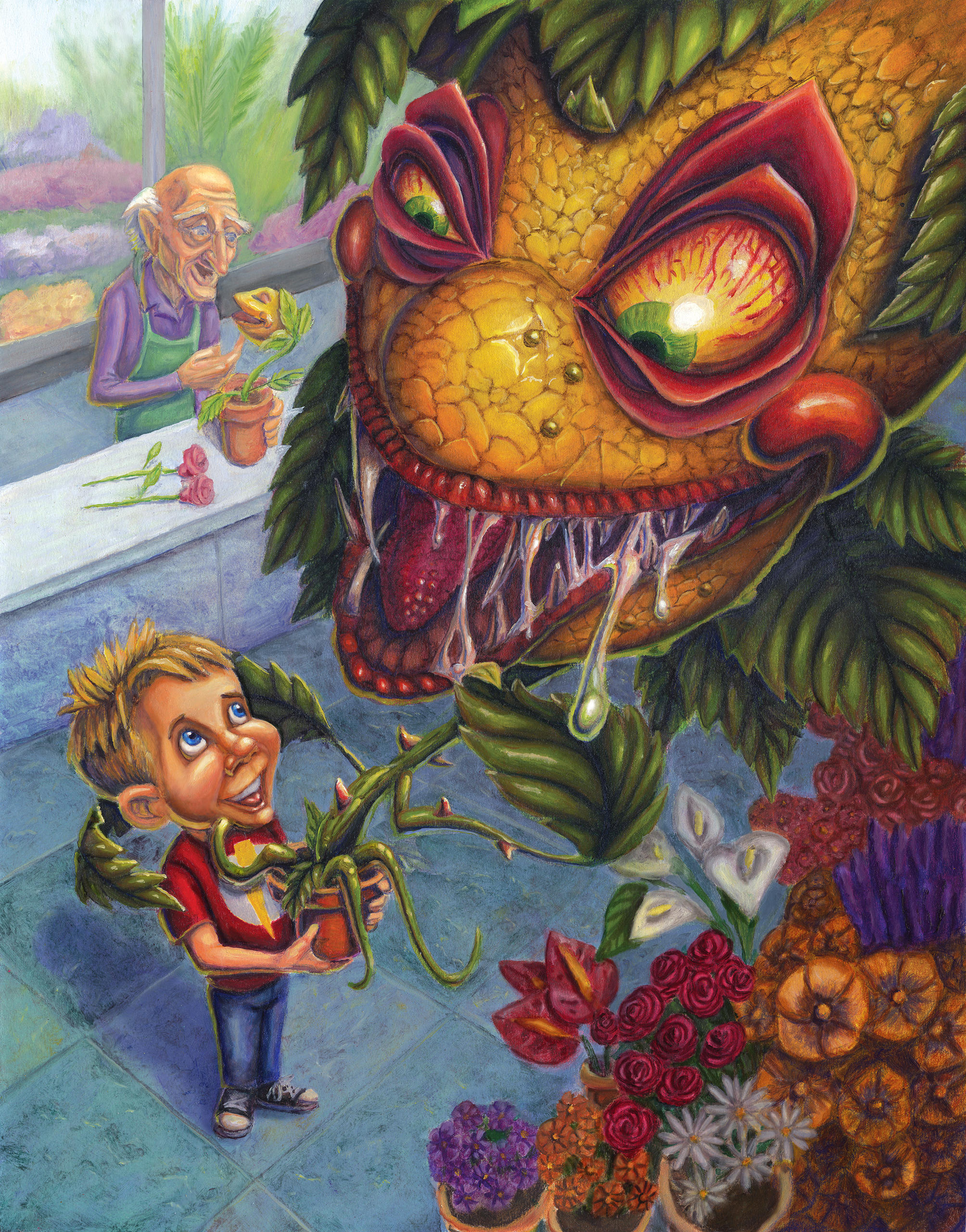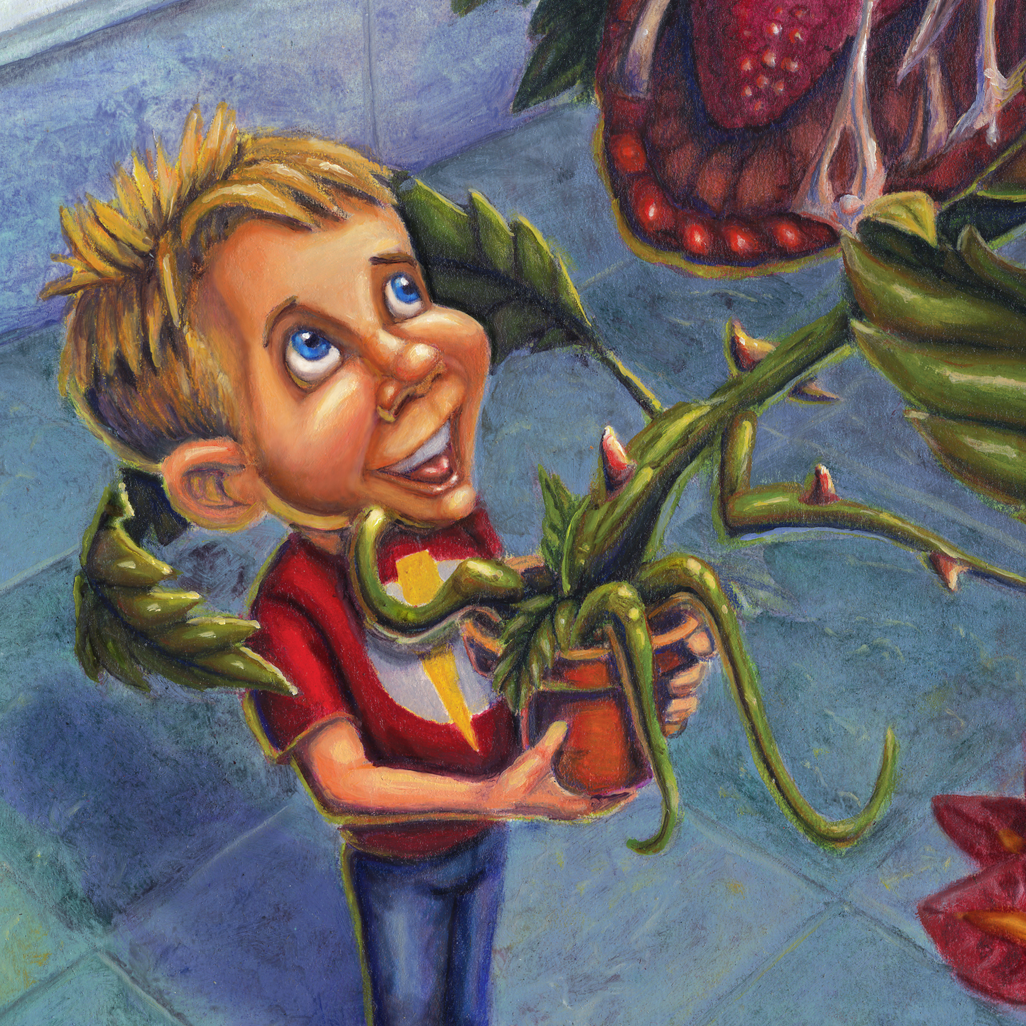 I was asked to Illustrate a flower shop so I began with sketches of a quaint shop featuring a lady and a young girl surrounded by flowers. However, I wanted to offer a unique and unexpected perspective. Embracing storytelling with contrast, I played with the notions of big and small, old and young, and ‘scary’ vs light-hearted. I was inspired by Little Shop of Horrors and Mario’s piranha plants. I created this illustration featuring a boy holding a giant monstrous plant with an old man caring for a young monster plant in the background. I love to empower children through my art, and I aimed to do that with this illustration by depicting a child confidently befriending something that may seem scary because it’s different. The original illustration was created with acrylic, pastel, colored pencil, and inks on illustration board, with digital touchups after scanning. Tap the “Let’s Talk!” button below to inquire about collaborating with me.