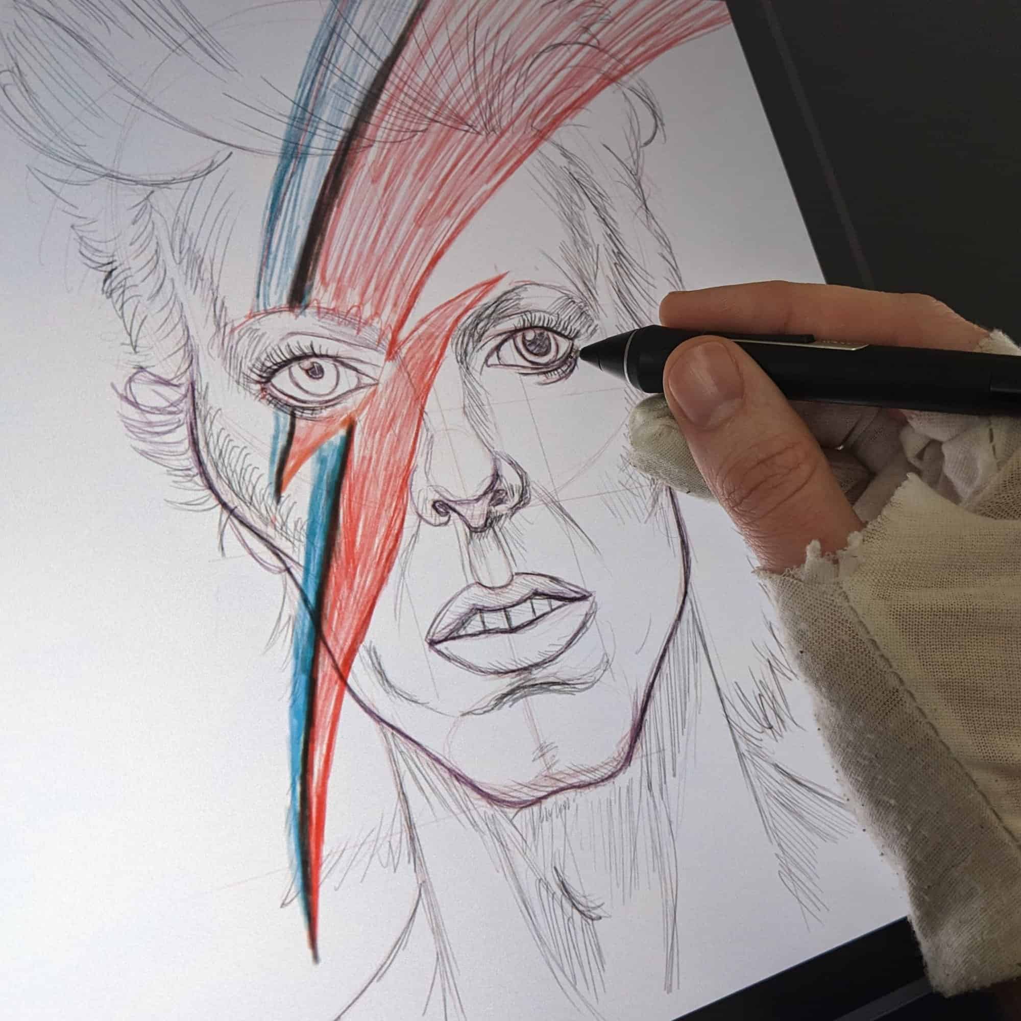 This illustration though it may look like it could have been painted with acrylic or oil is actually a digital painting. I painted it by hand in photoshop using a Wacom Cintiq. Before I began the digital painting, I did research on David Bowie, his Ziggy Stardust and Aladdin Sane personas, and of course, the albums and songs that influenced this piece. I worked from dozens of reference photos to make sure I could truly capture “The Starman”. I also listened to the music of David Bowie while working on this digital illustration to stay inspired and connected to the incredible artist. As with all my illustrations I started with a sketch and line drawing before I started painting. To get the final painterly look and feel I used Photoshop brushes that have a feel like traditional brushes. I also applied some paper textures over the final digital painting to make it feel like it could have been painted on illustration board.