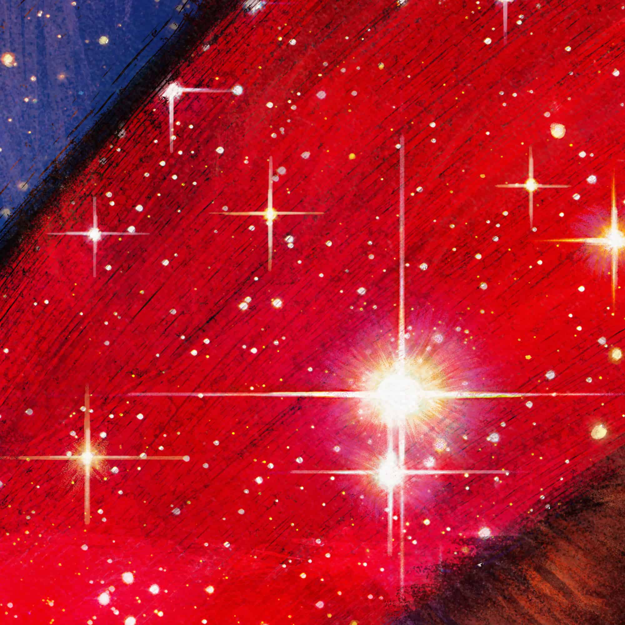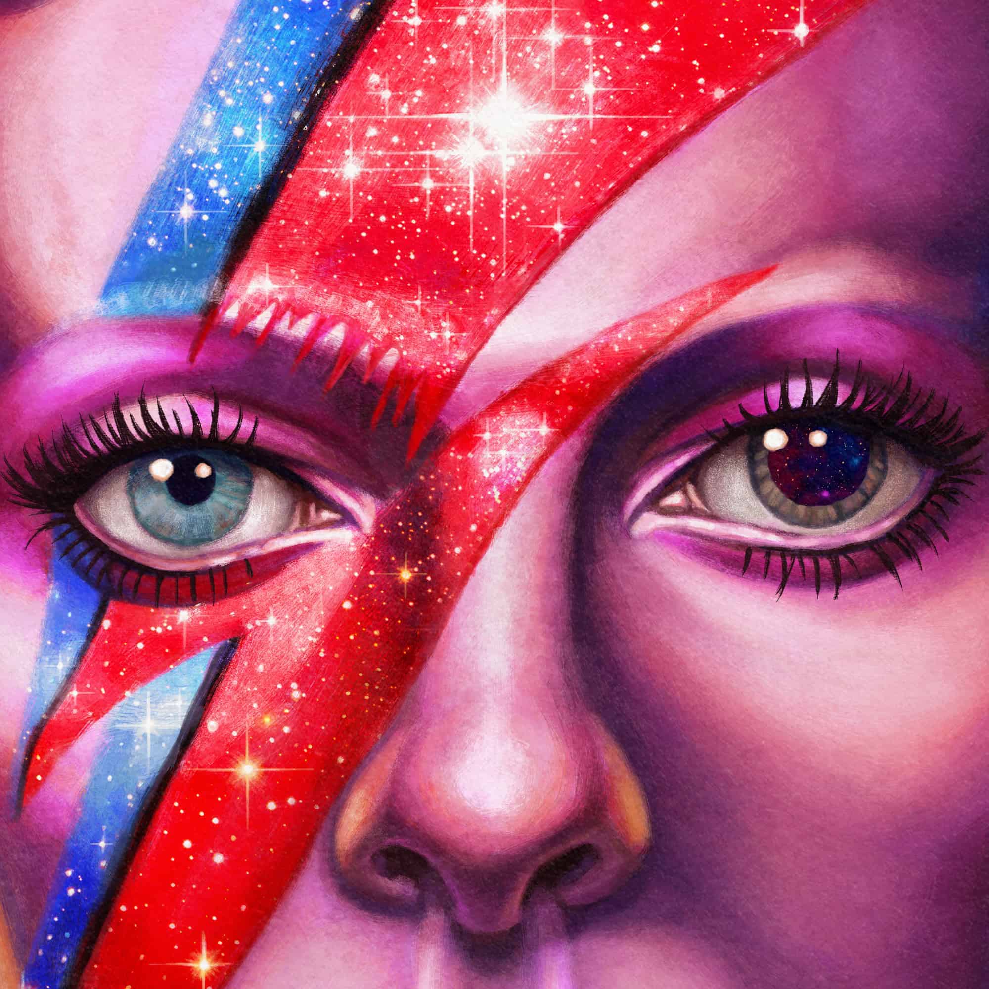 I played off all of this as inspiration for this illustration. The iconic lightning bolt from Aladdin Sane, Ziggy Stardust’s evolution, and Bowie’s position as a star now. The stars in the lightning bolt are a reference to Ziggy Stardust, especially the cluster in the middle of his forehead, which is a wink back to the moon Ziggy wore on his forehead. The background is a reference to the celestial nature of Starman, and his message of hope to our planet’s youth. There is also the reference to a space invader from “Moonage Day Dream”. The lighting also speaks to his message of hope and celestial nature. The lightning bolt which is no longer just mere makeup on his face, but expanding out on either side can be seen as Bowie’s rise to fame, his and our minds expanding, and as a reference to blowing our minds. If you zoom in and look closely at Bowie’s left eye in this illustration, you will see space, stars, and parts of a galaxy in the pupil. Perhaps referencing The Starman’s view into something bigger and more vast than we understand.